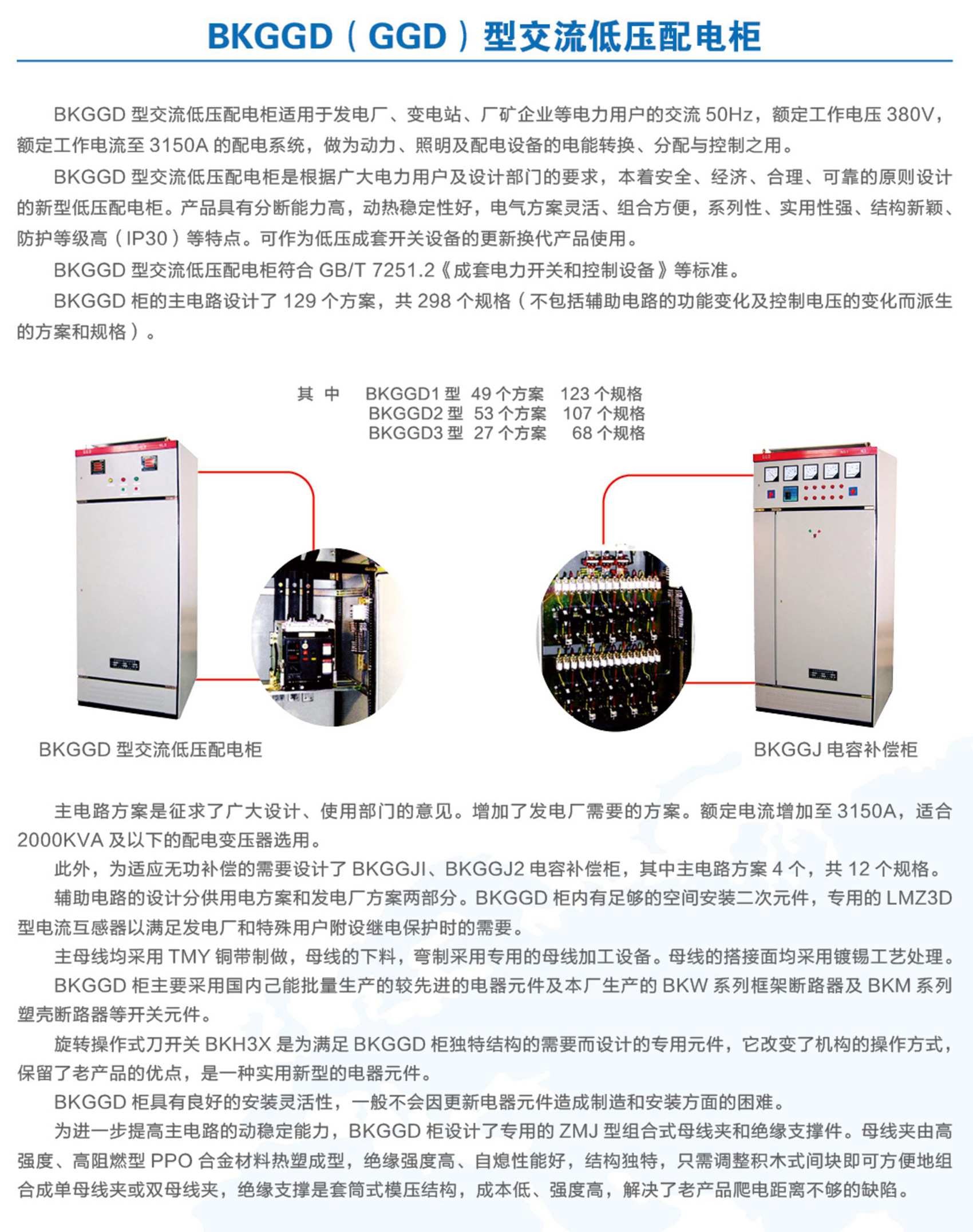 BKGGD型交流低壓配電柜適用于發(fā)電廠、變電站、廠礦企業(yè)等電力用戶的交流50Hz,額定工作電壓380V,額定工作電流至3150A的配電系統(tǒng),做為動力、照明及配電設備的電能轉換、分配與控制之用。BKGGD型交流低壓配電柜是根據(jù)廣大電力用戶及設計部門的要求,本著安全、經濟、合理、可靠的原則設計的新型低壓配電柜。產品具有分斷能力高,動熱穩(wěn)定性好,電氣方案靈活、組合方便,系列性、實用性強、結構新穎、防護等級高等特點。可作為低壓成套開關設備的更新?lián)Q代產品使用。