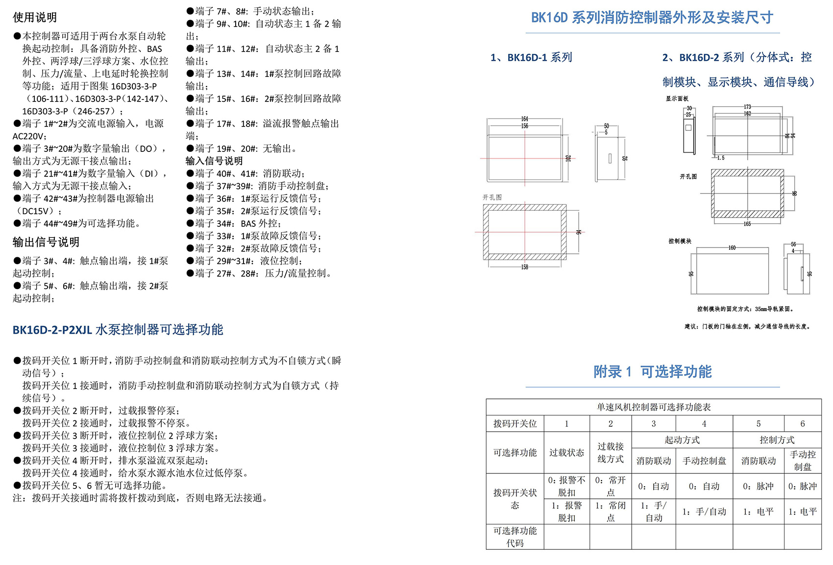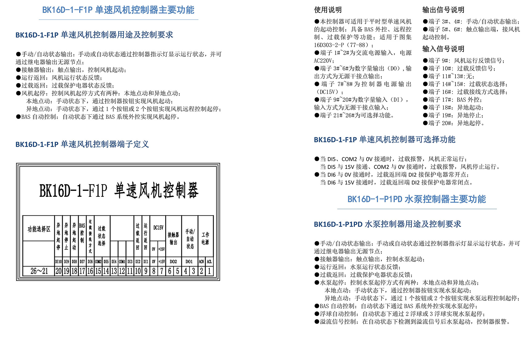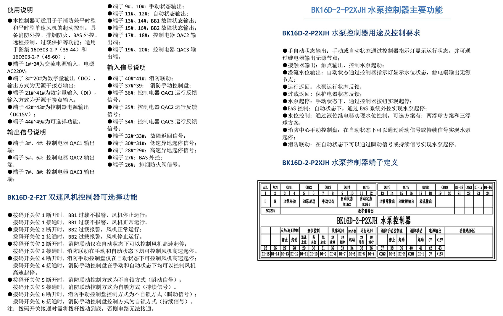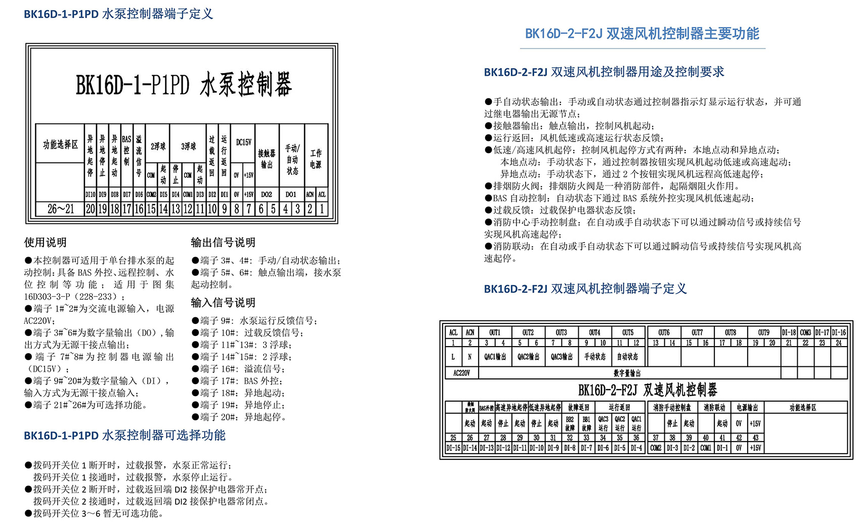 BK16D系列電動設備控制器是一款針對行業風機水泵控制箱設計的系列產品,產品滿足國家建筑標準設計圖集《16D303-2 常用風機控制電路圖》及《16D303-3 常用水泵控制電路圖》。本產品采用智能化手段,用邏輯計算代替了傳統的按鈕、指示燈、轉換開關、中間繼電器、時間繼電器等器件,接線方便,簡單快捷。相較于傳統的接線方式,本產品可節約硬件投入、減少二次布線、節約工時,并具備故障率低,檢修方便。