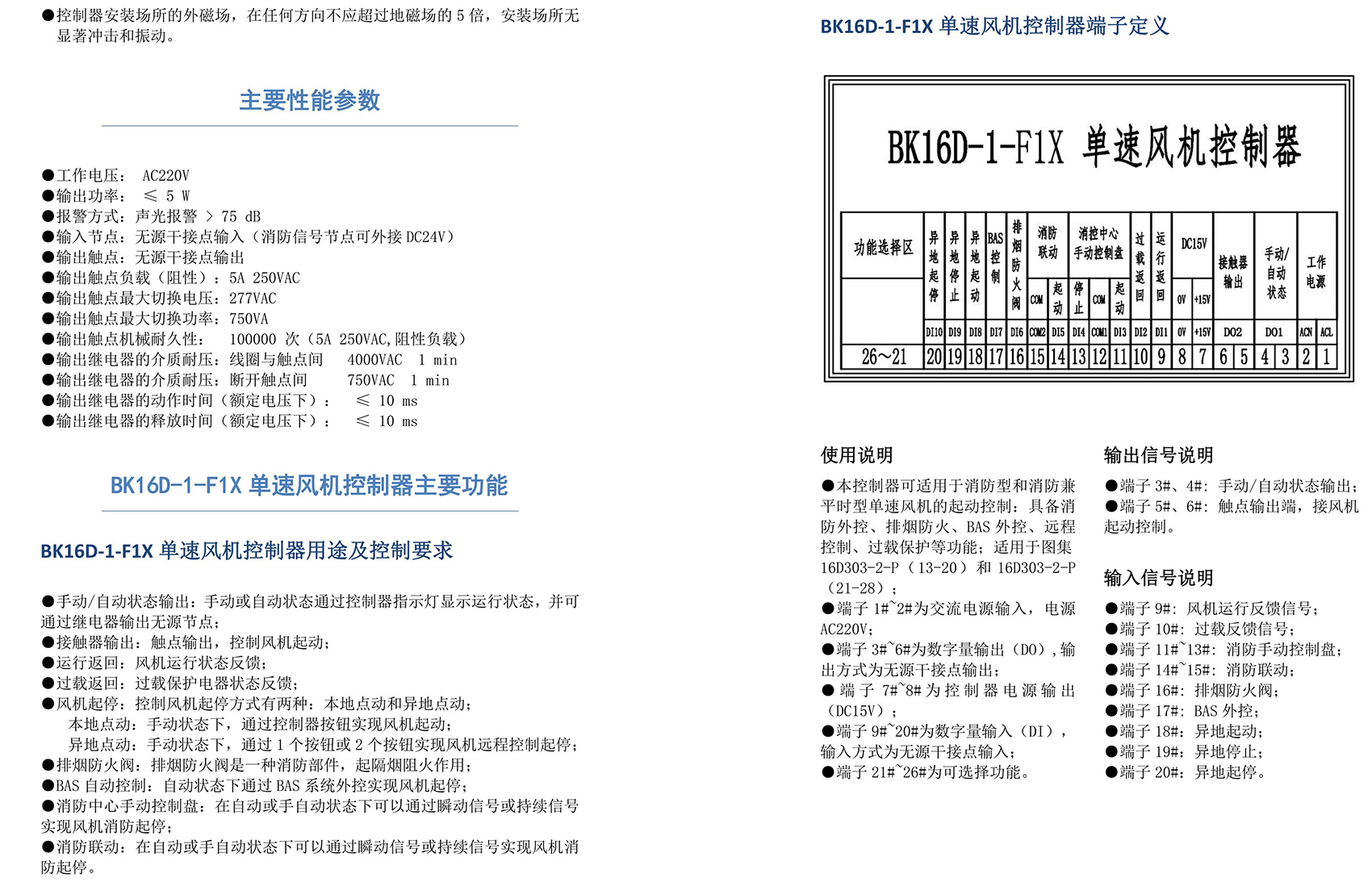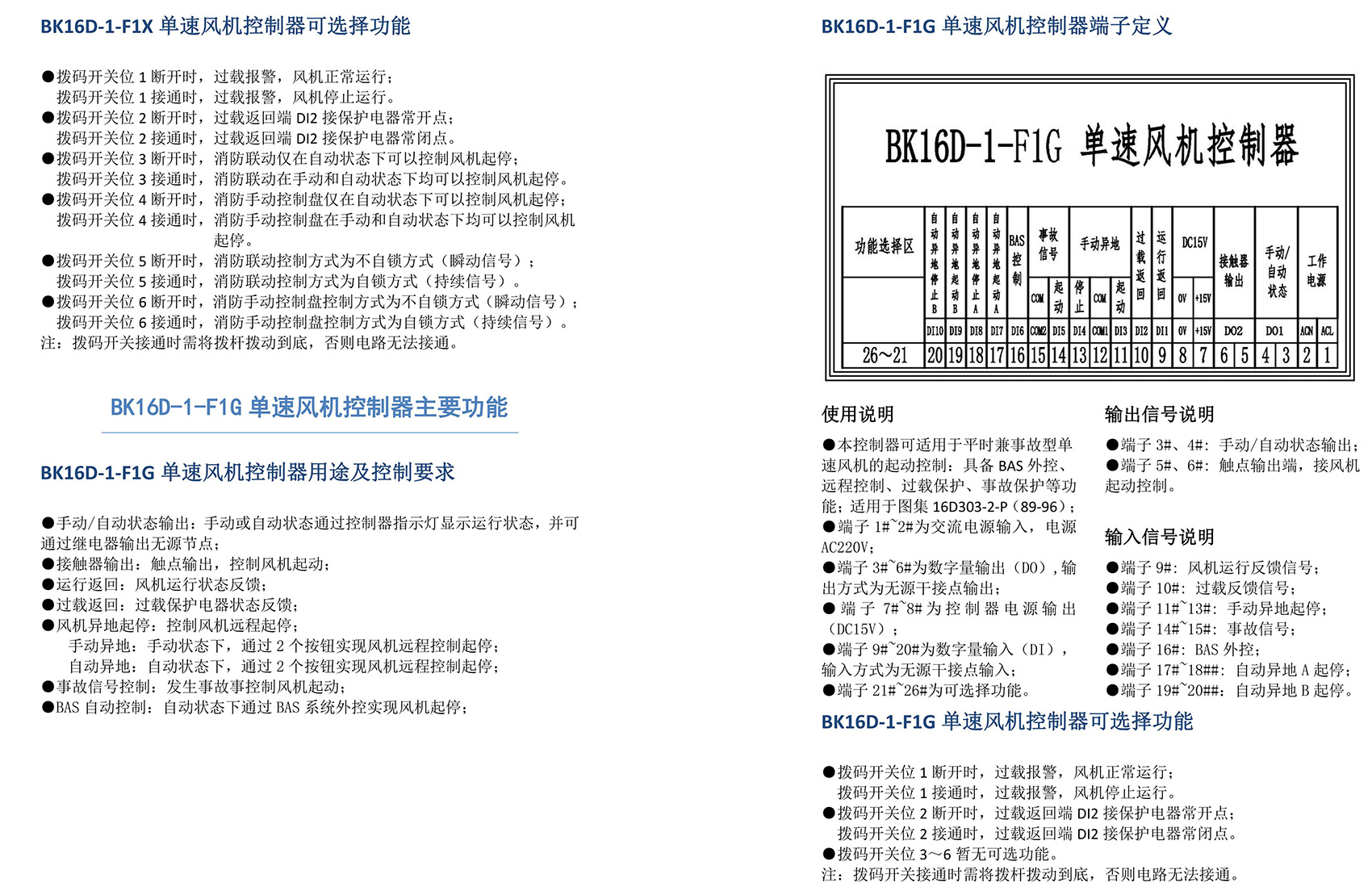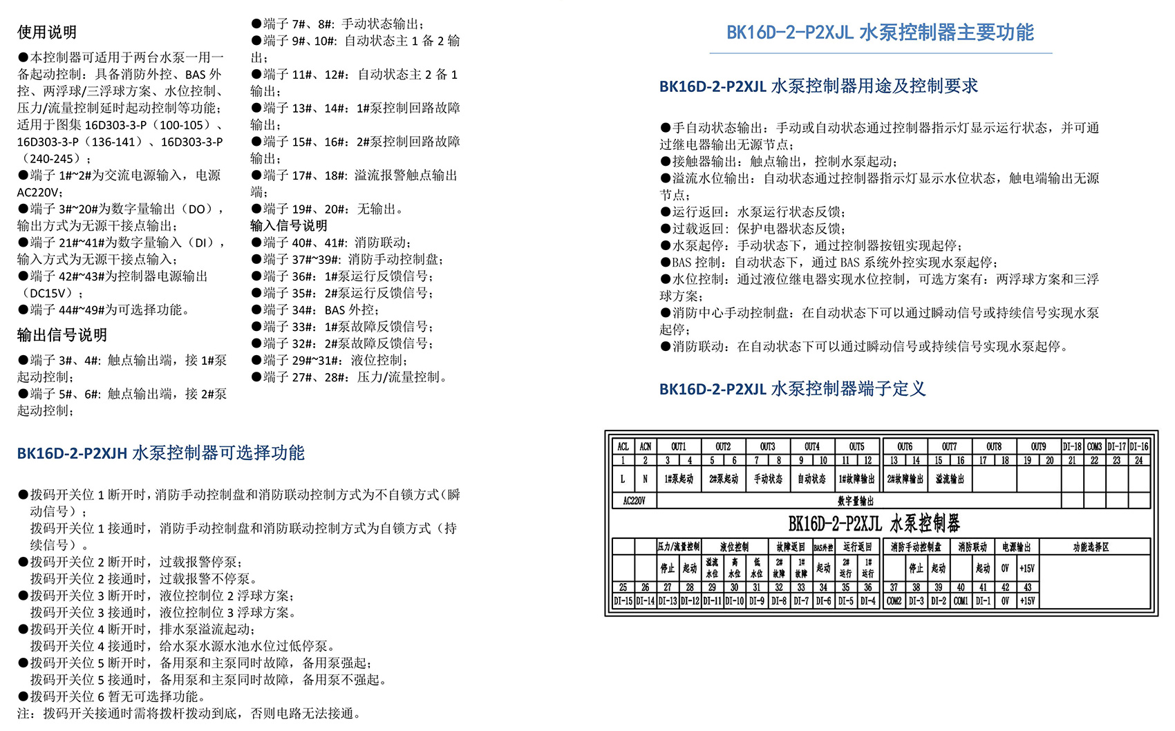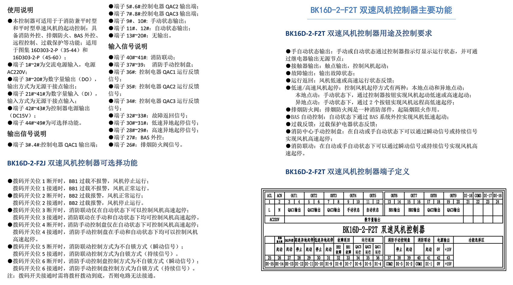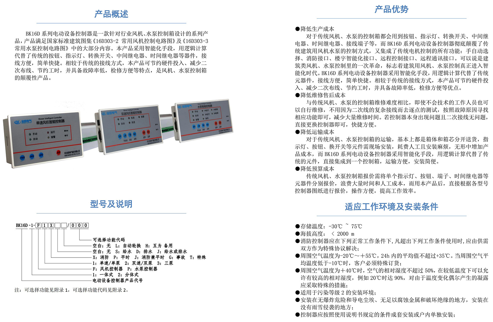 BK16D系列電動設備控制器是一款針對行業風機水泵控制箱設計的系列產品,產品滿足國家建筑標準設計圖集《16D303-2 常用風機控制電路圖》及《16D303-3 常用水泵控制電路圖》。本產品采用智能化手段,用邏輯計算代替了傳統的按鈕、指示燈、轉換開關、中間繼電器、時間繼電器等器件,接線方便,簡單快捷。相較于傳統的接線方式,本產品可節約硬件投入、減少二次布線、節約工時,并具備故障率低,檢修方便。