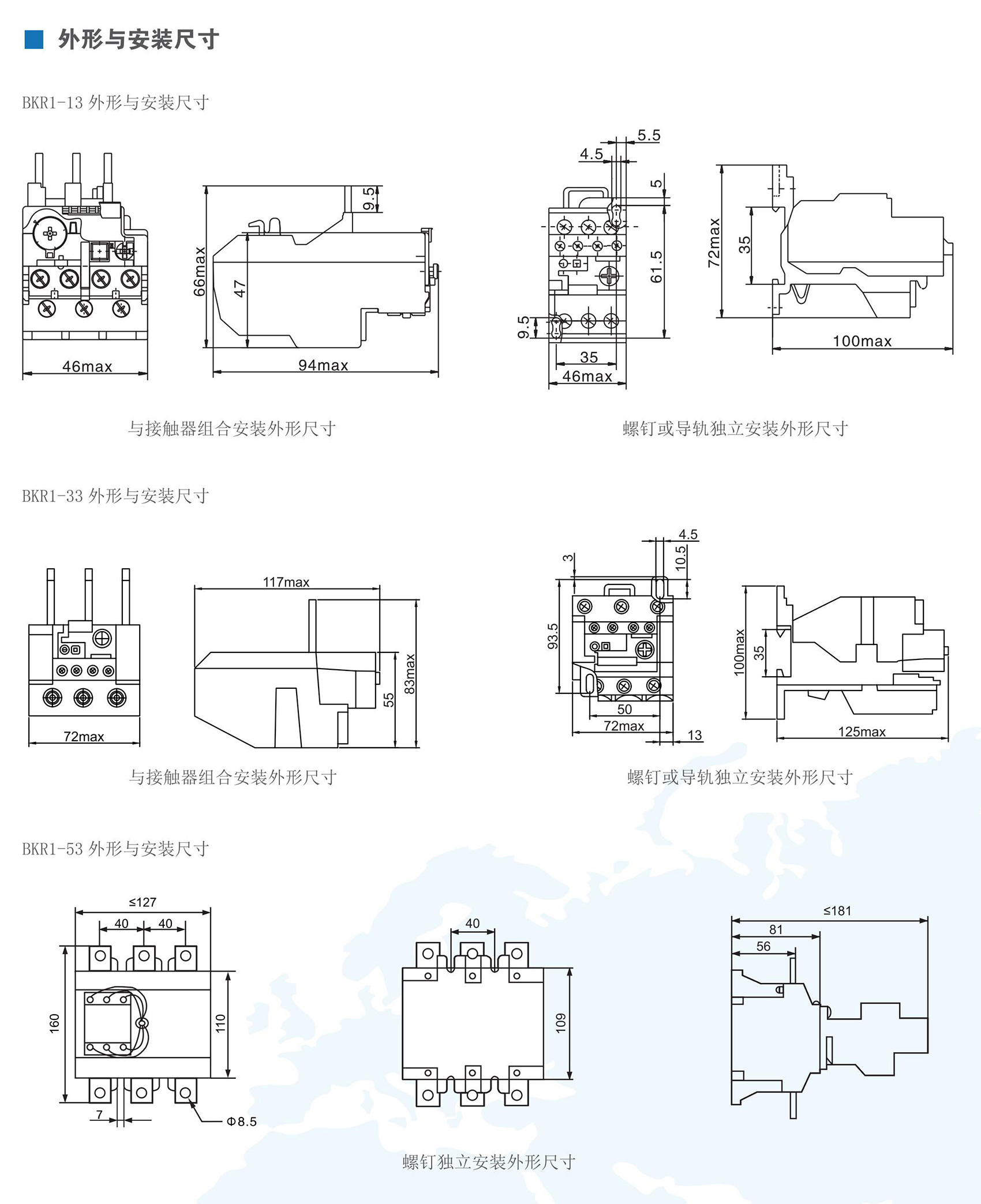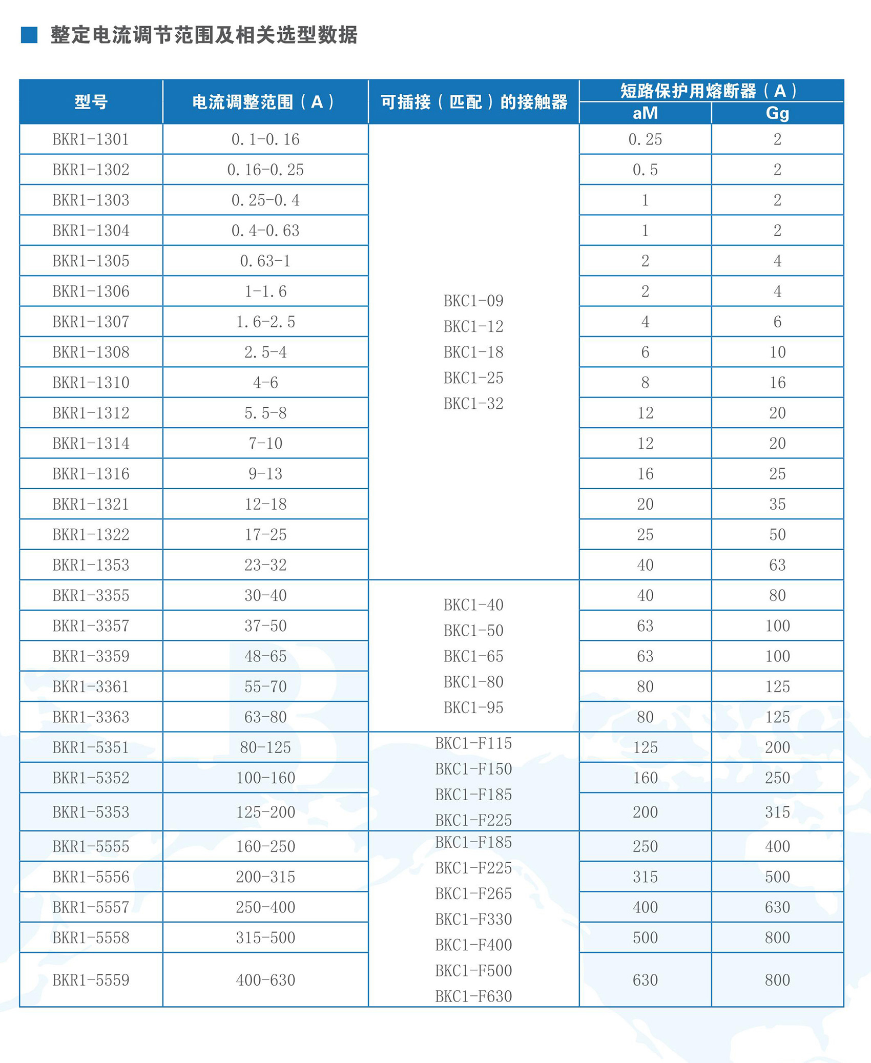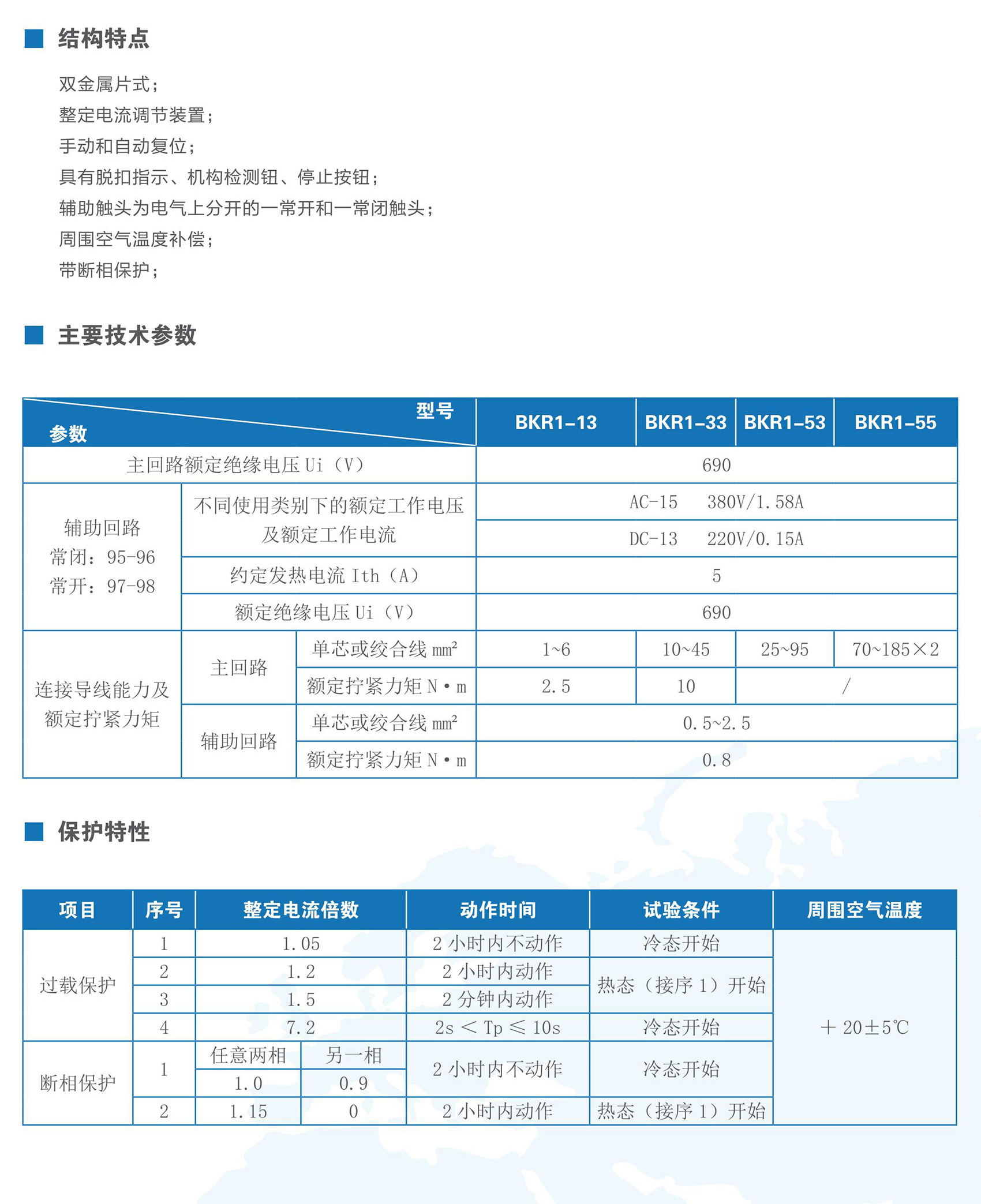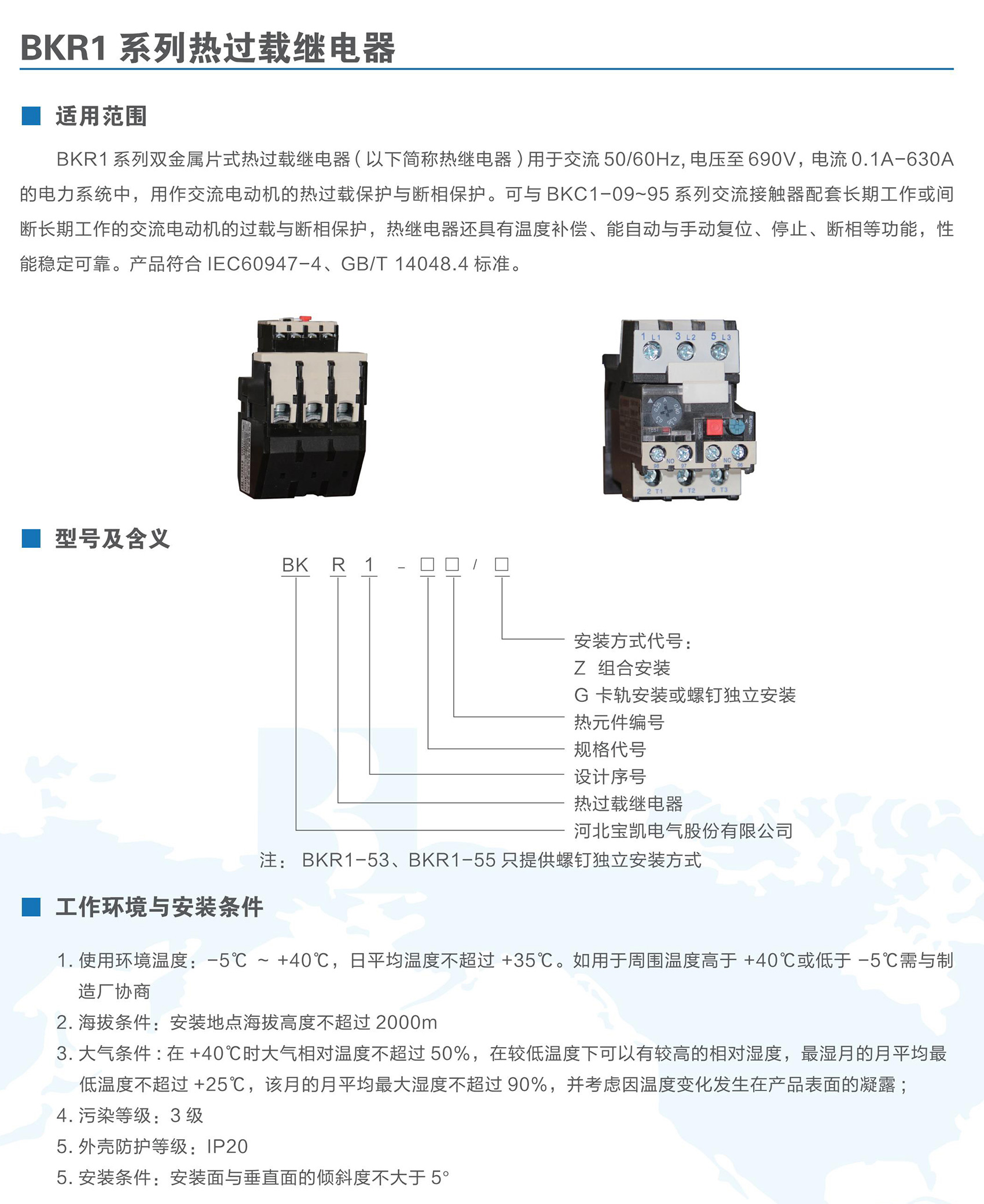 BKR1系列熱過載繼電器,在交流50Hz(60Hz)、額定電壓至690V、電流0.1A至630A的電路中,作三相交流電動機的過載和斷相保護之用。熱過載繼電器具有溫度補償、動作指示、自動和手動復位、停止等功能,性能穩定可靠。產品符合IEC 60947-4、GB/T 14048.4、GB/T 14048.5標準。
