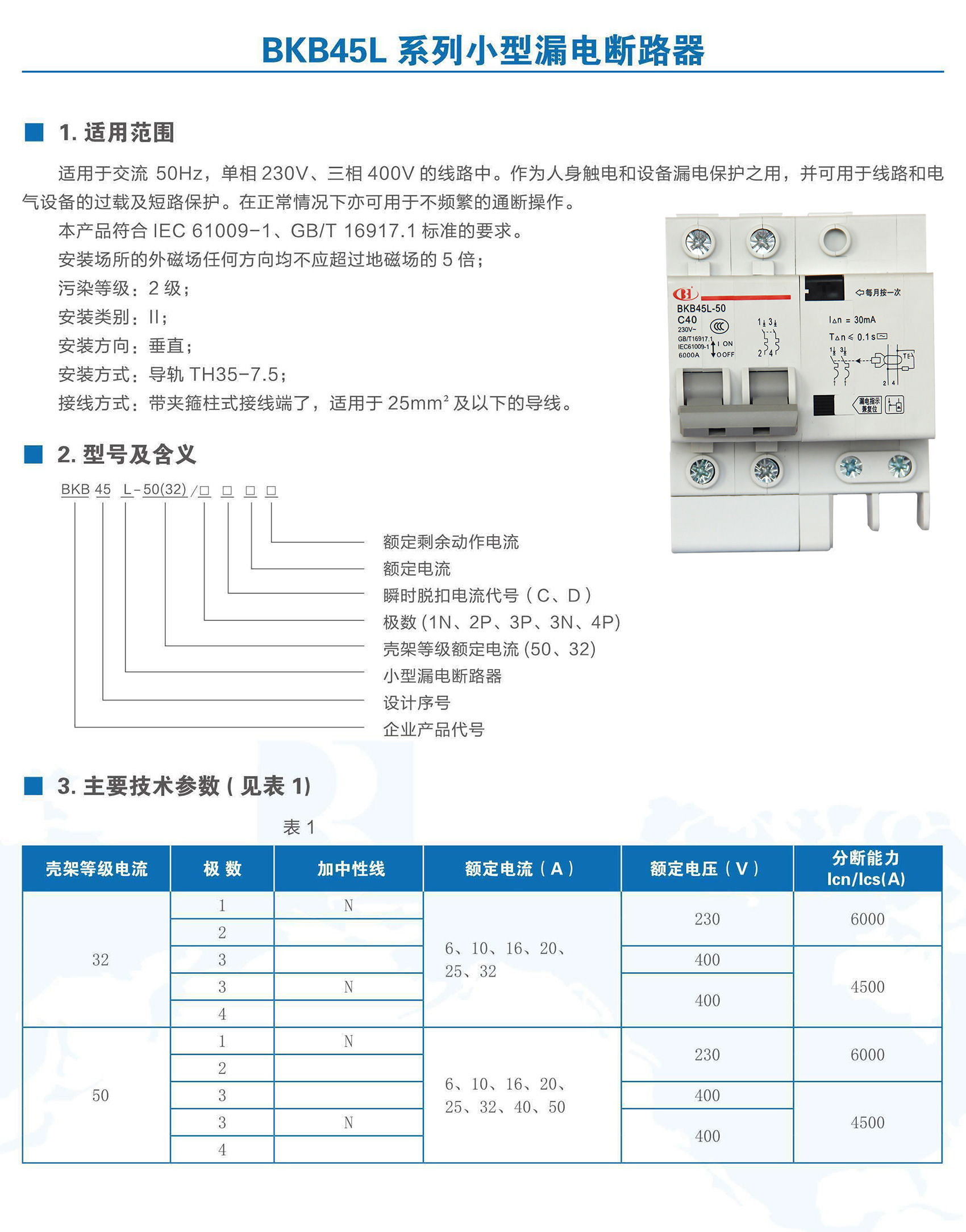 BKB45L-50系列帶剩余電流保護小型斷路器適用于交流50Hz、額定電壓至400V,額定電流6~50A 的線路中。作為人身觸電和設備漏電保護之用,并可用于線路和電氣設備的過載以及短路保護。在正常情況下亦可用于不頻繁的通斷操作。本產品符合GB/T 16917.1、IEC 61009-1標準。