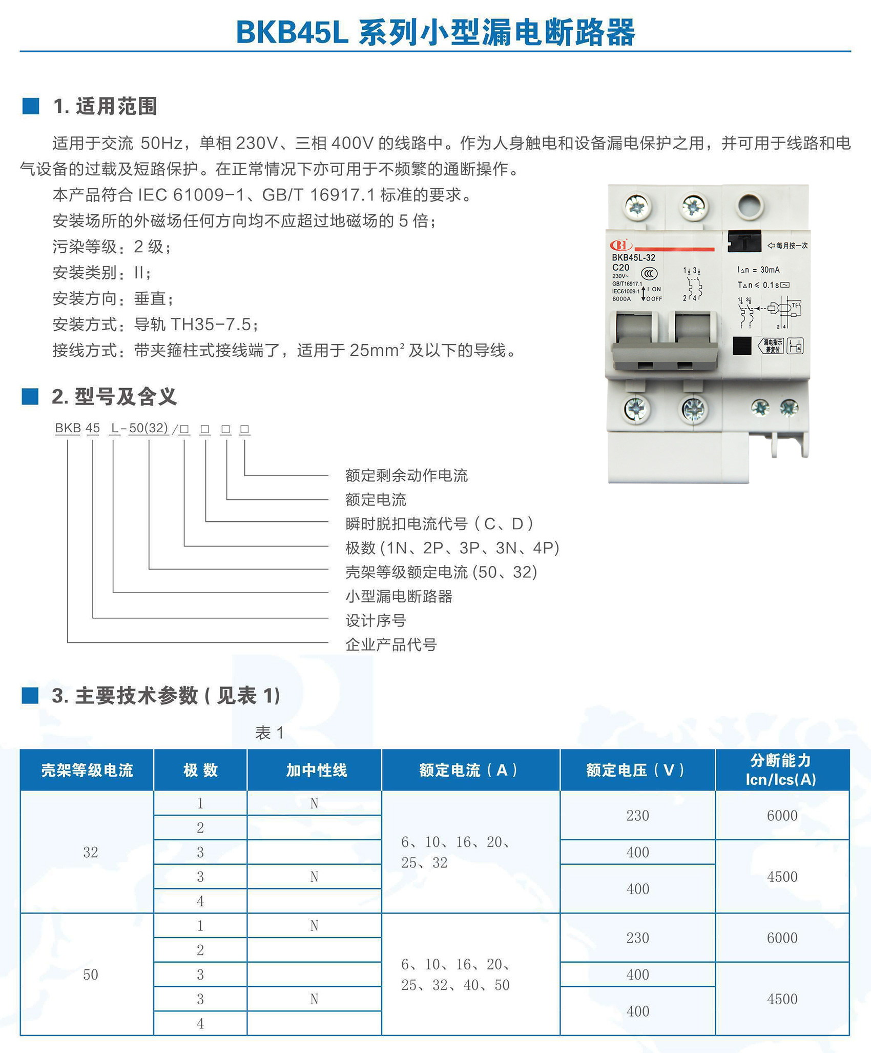 BKB45L-32系列帶剩余電流保護小型斷路器適用于交流50Hz、額定電壓至400V,額定電流6~32A 的線路中。作為人身觸電和設(shè)備漏電保護之用,并可用于線路和電氣設(shè)備的過載以及短路保護。在正常情況下亦可用于不頻繁的通斷操作。本產(chǎn)品符合GB/T 16917.1、IEC 61009-1標準。