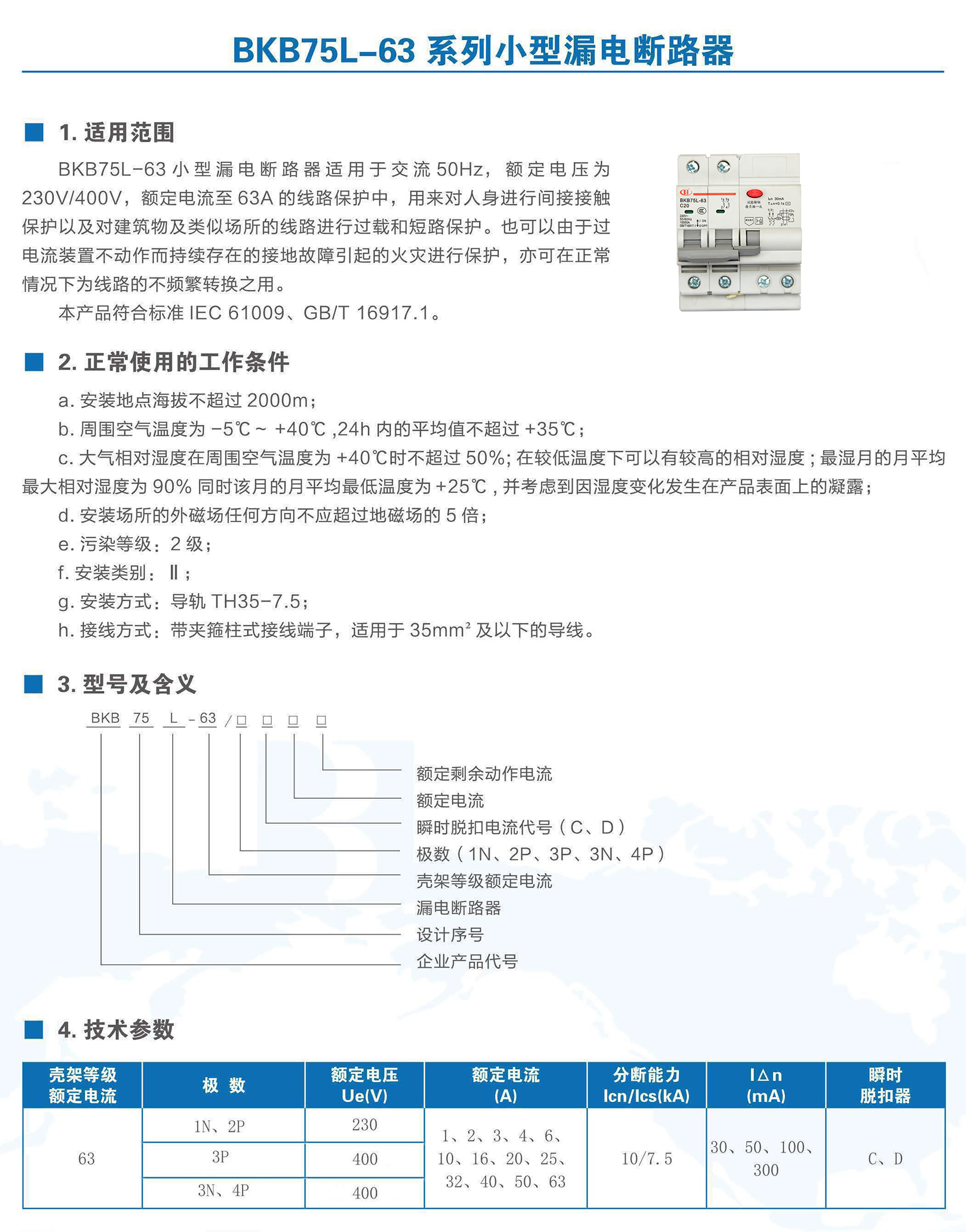 BKB75L-63系列帶剩余電流保護(hù)小型斷路器適用于交流50/60Hz、額定電壓至400V,額定電流1~63A 的線路中。作為人身觸電和設(shè)備漏電保護(hù)之用,并可用于線路和電氣設(shè)備的過載以及短路保護(hù)。在正常情況下亦可用于不頻繁的通斷操作。本產(chǎn)品符合GB/T 16917.1、IEC 61009-1標(biāo)準(zhǔn)。