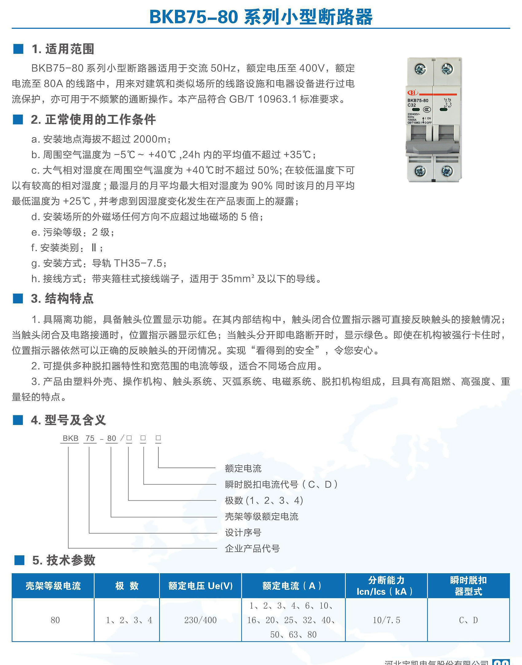 BKB75-80系列小型斷路器適用于交流50Hz,額定電壓至400V,額定電流1~80A,額定絕緣電壓690V的系統線路中。用來對建筑電廠、變電站、電信、交通、冶金、工礦業等及類似場所的系統線路、電氣設備進行過電流保護,也可以用于不頻繁的通斷操作。適用于非專業人員使用且不需要進行維護。本產品符合GB/T 10963.1、IEC 60898-1標準。