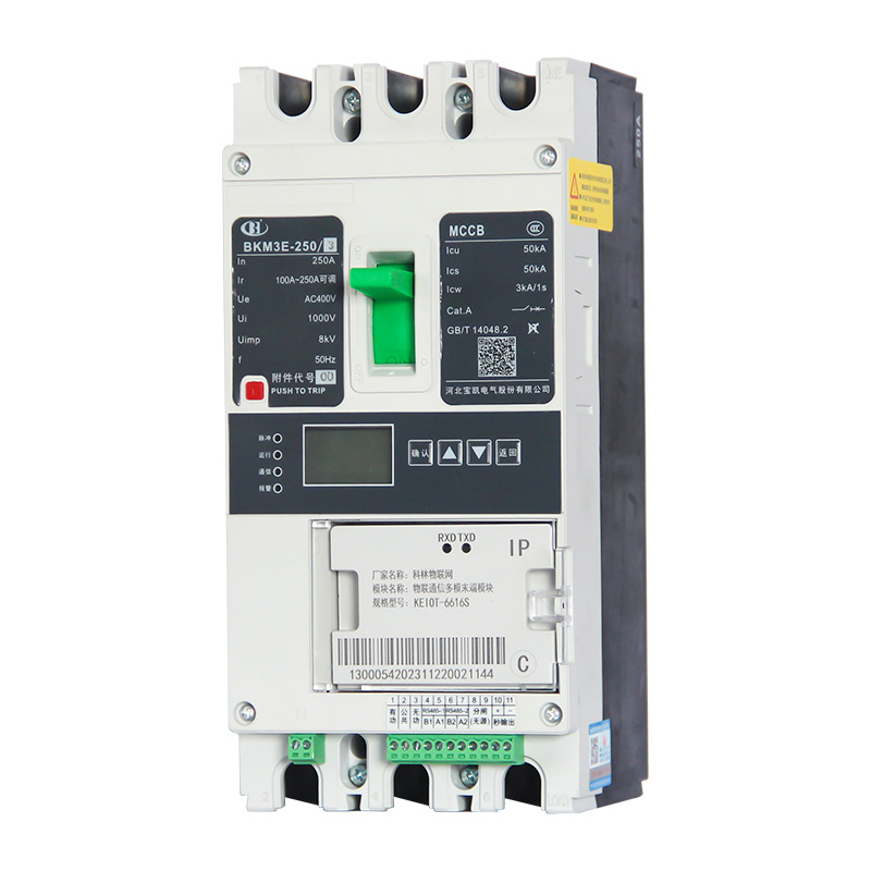 BKM3E系列塑料外殼式斷路器適用于交流50Hz,額定絕緣電壓1000V,額定工作電壓至400V,額定電流至400A的配電網絡中。本系列斷路器具備過載長延時、短路短延時、短路瞬時、過欠壓及斷相保護功能,對線路和電源設備起保護作用。可以向終端設備反饋產品的電流、電壓、功率、電能、壽命等信息,用于對負載端的檢測和監控,降低電網的運維成本,也為將來的能效系統提供必要的數據。本系列斷路器還具有配電網絡拓撲關系自動識別和電力線載波通訊功能。本系列斷路器執行標準:IEC 60947-1,GB/T 14048.1 《低壓開關設備和控制設備 第1部分:總則》IEC 60947-2,GB/T 14048.2 《低壓開關設備和控制設備 第2部分:斷路器》