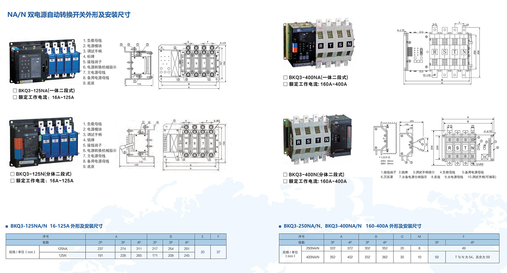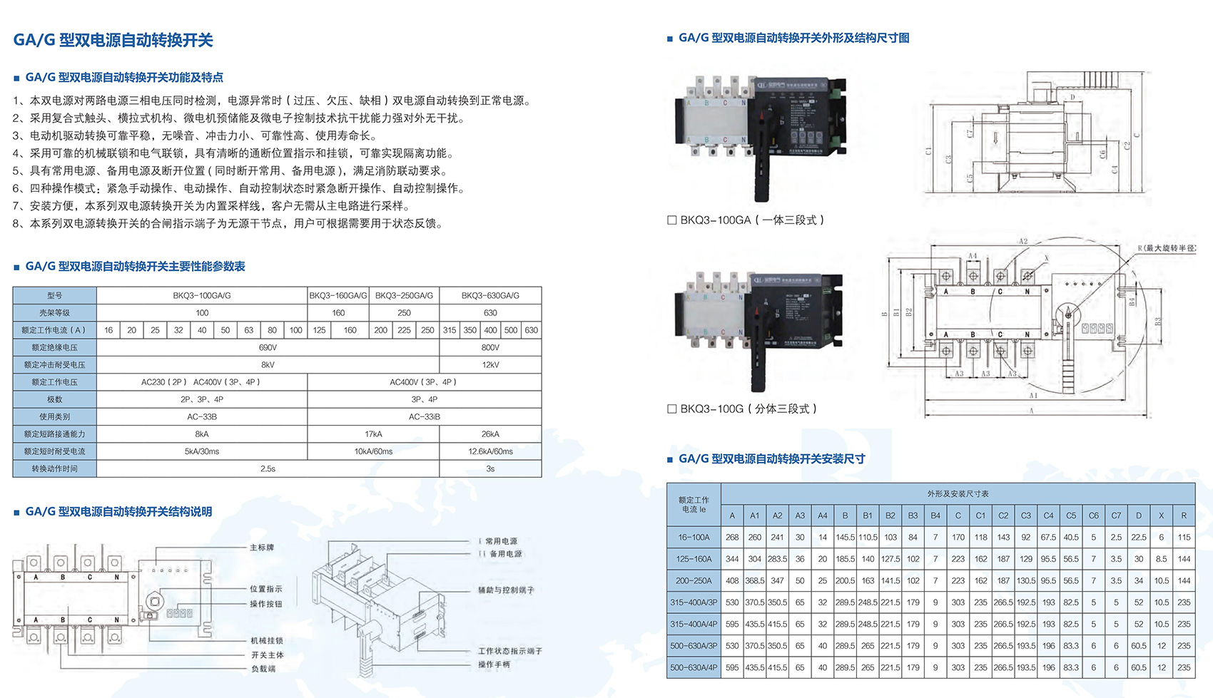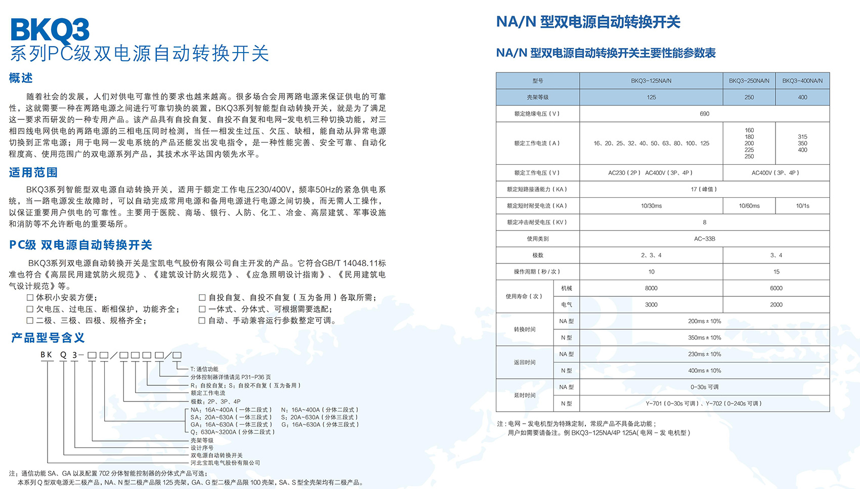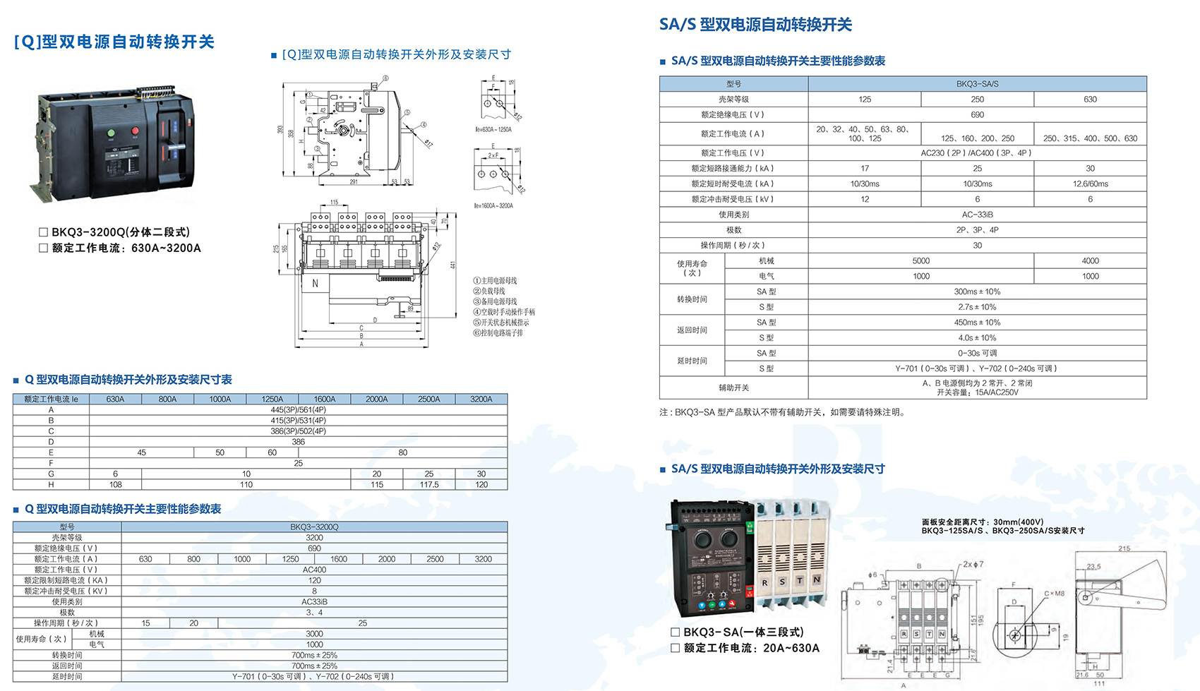 BKQ3-3200Q系列自動轉換開關電器適用于交流50/60Hz,額定工作電壓400V,額定電流800A至3200A的雙路配電系統中,產品由開關本體與轉換控制器兩部分組成,本體采用電磁線圈驅動,轉換速度快;轉換控制器具有對兩路三相電源的過電壓、欠電壓、缺相等故障檢測功能;同時帶有發電機組啟、停信號輸出。主要應用于醫院、商場、銀行、化工、高層建筑、軍事設施、消防等不允許斷電的重要場所。產品符合GB/T 14048.11《低壓開關設備和控制設備 第 6-1 部分:多功能電器 轉換開關電器》。
