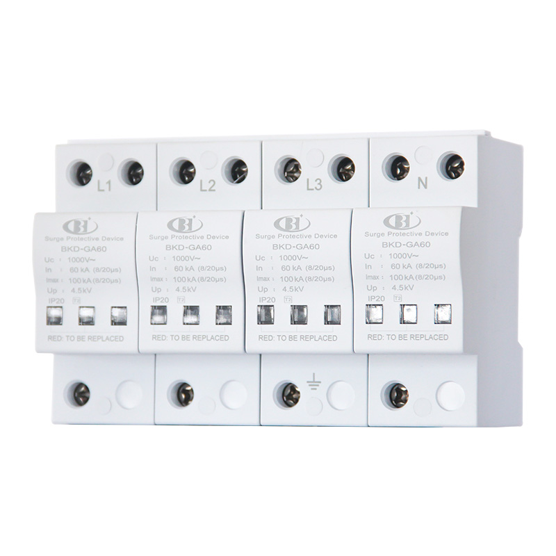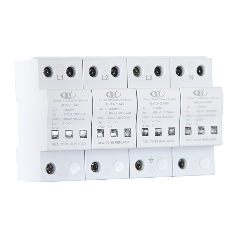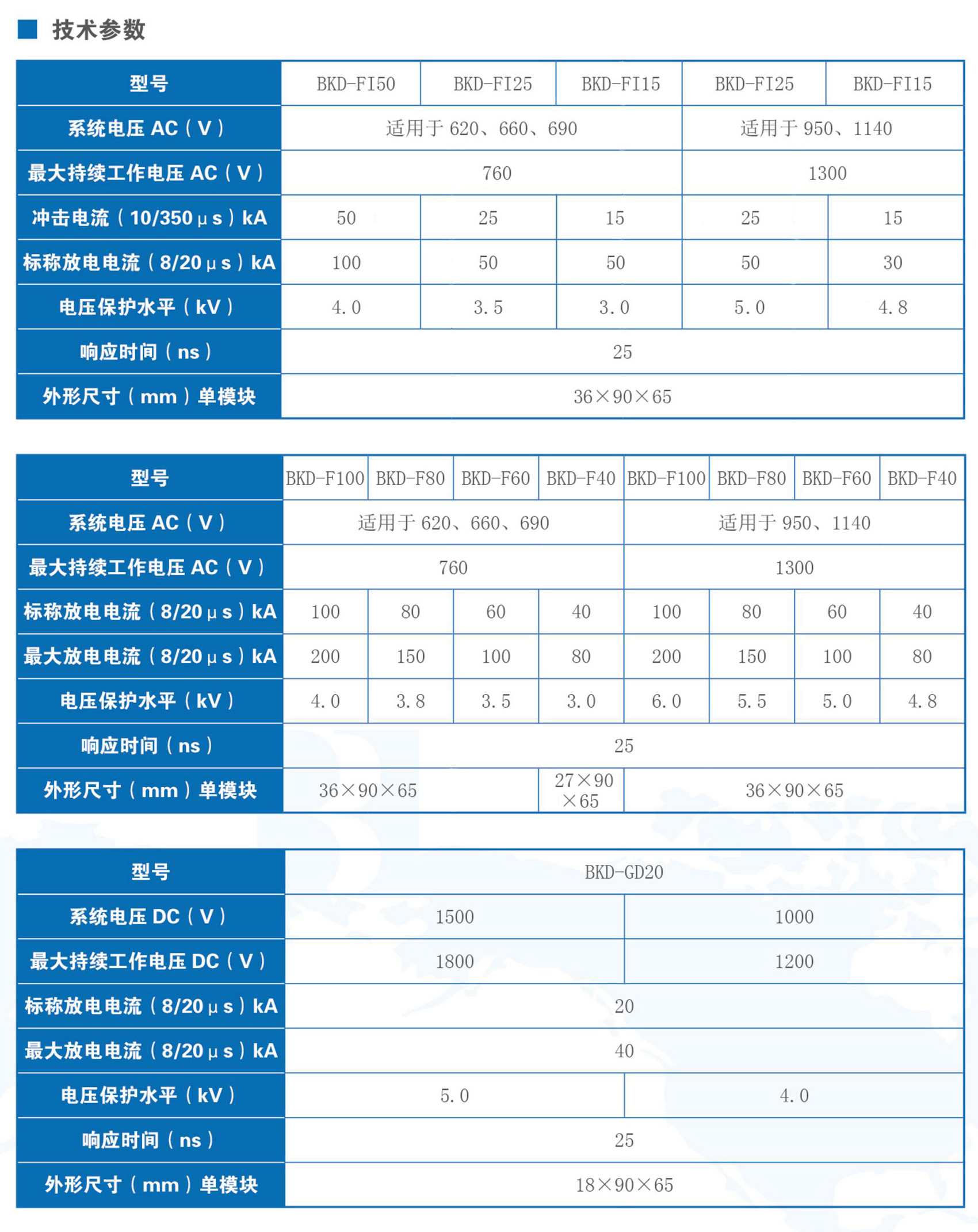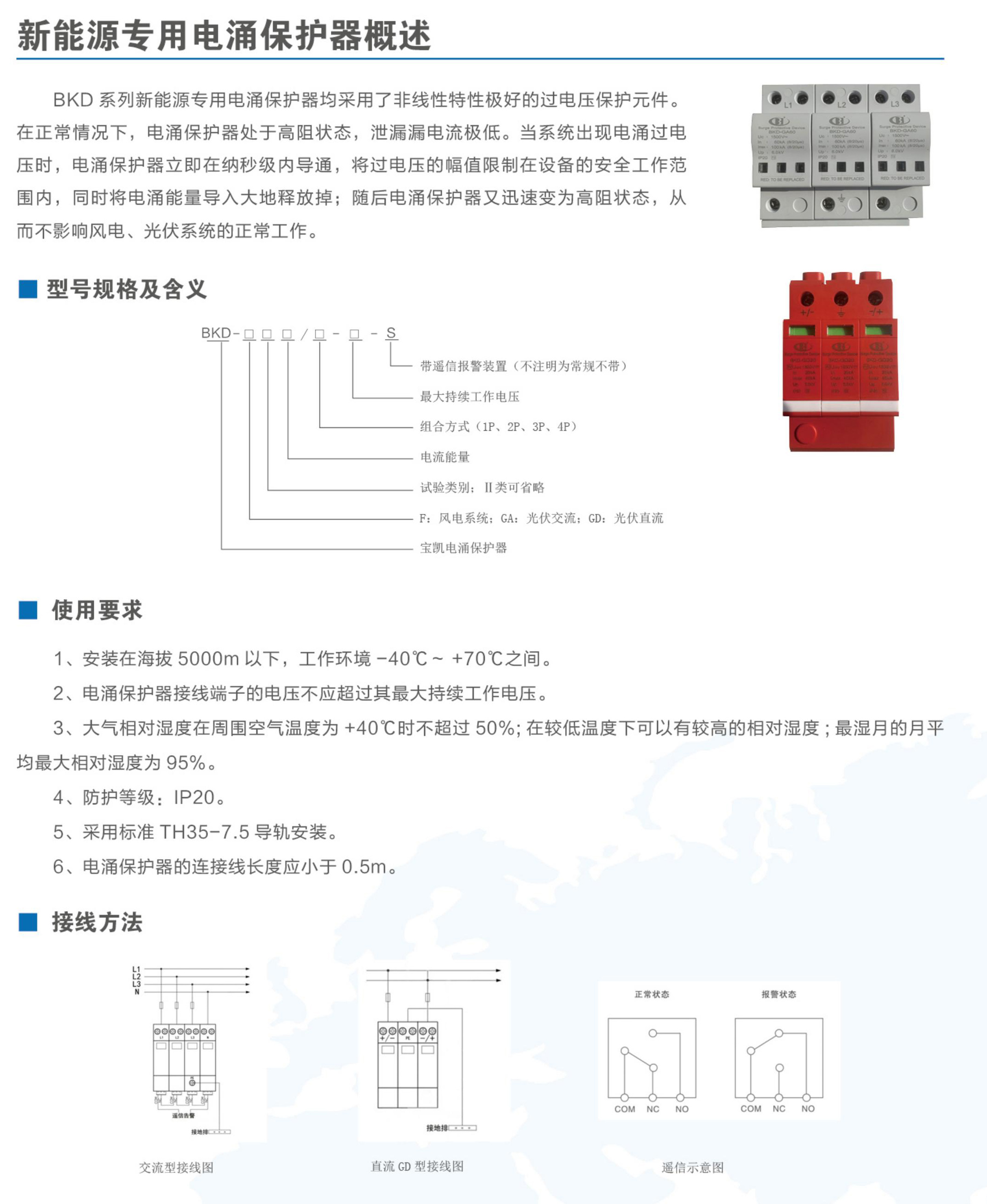 BKD系列新能源專用電涌保護器均采用了非線性特性極好的過電壓保護元件。在正常情況下,電涌保護器處于高阻狀態,泄漏漏電流極低。當系統出現電涌過電壓時,電涌保護器立即在納秒級內導通,將過電壓的幅值限制在設備的安全工作范圍內,同時將電涌能量導入大地釋放掉;隨后電涌保護器又迅速變為高阻狀態,從而不影響風電、光伏系統的正常工作。產品符合GB/T 18802.11、GB/T 18802.11標準。
